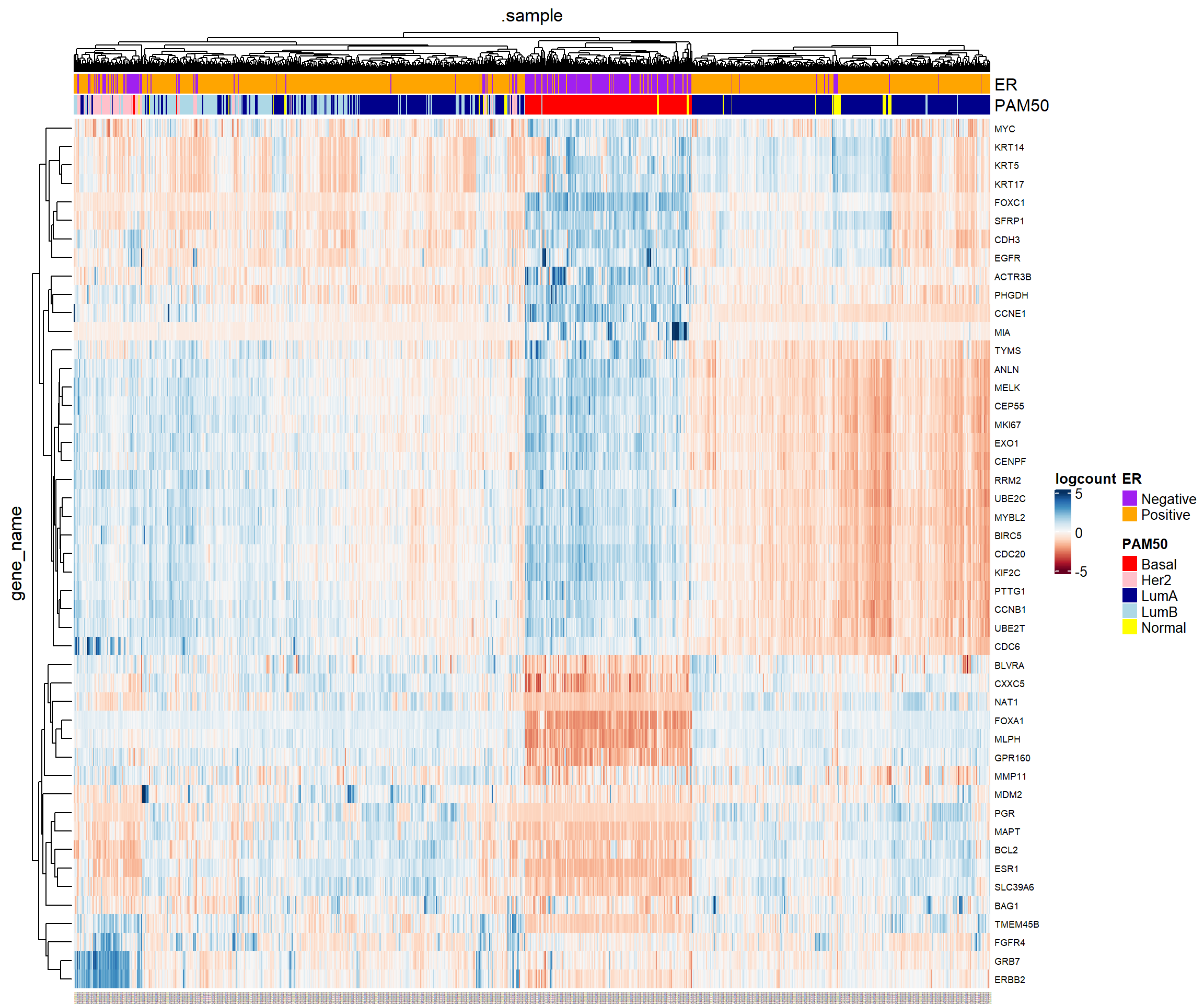 The tidyHeatmap function heatmap allows us to quickly add sample annotations to the plot, and since our data were using the tidy framework we have plenty of clinical variables at our fingertips. I’m choosing ER status and PAM50 classification, but you could add others such age, grade, or anything else.