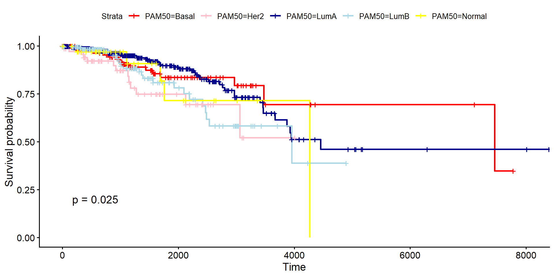fit <- survfit(Surv(Time, Status) ~ PAM50, data = clin_data_corrected)