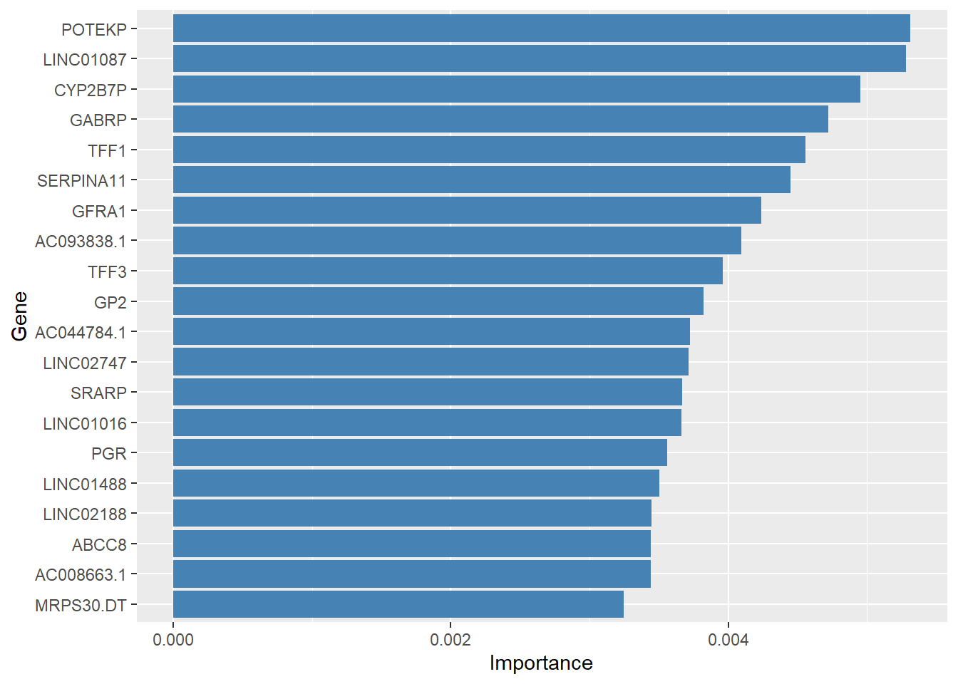 ggplot(aes(x = Importance, y = forcats::fct_reorder(term, Importance))) + geom_col(fill = "steelblue") + ylab("Gene") + xlab("Importance")