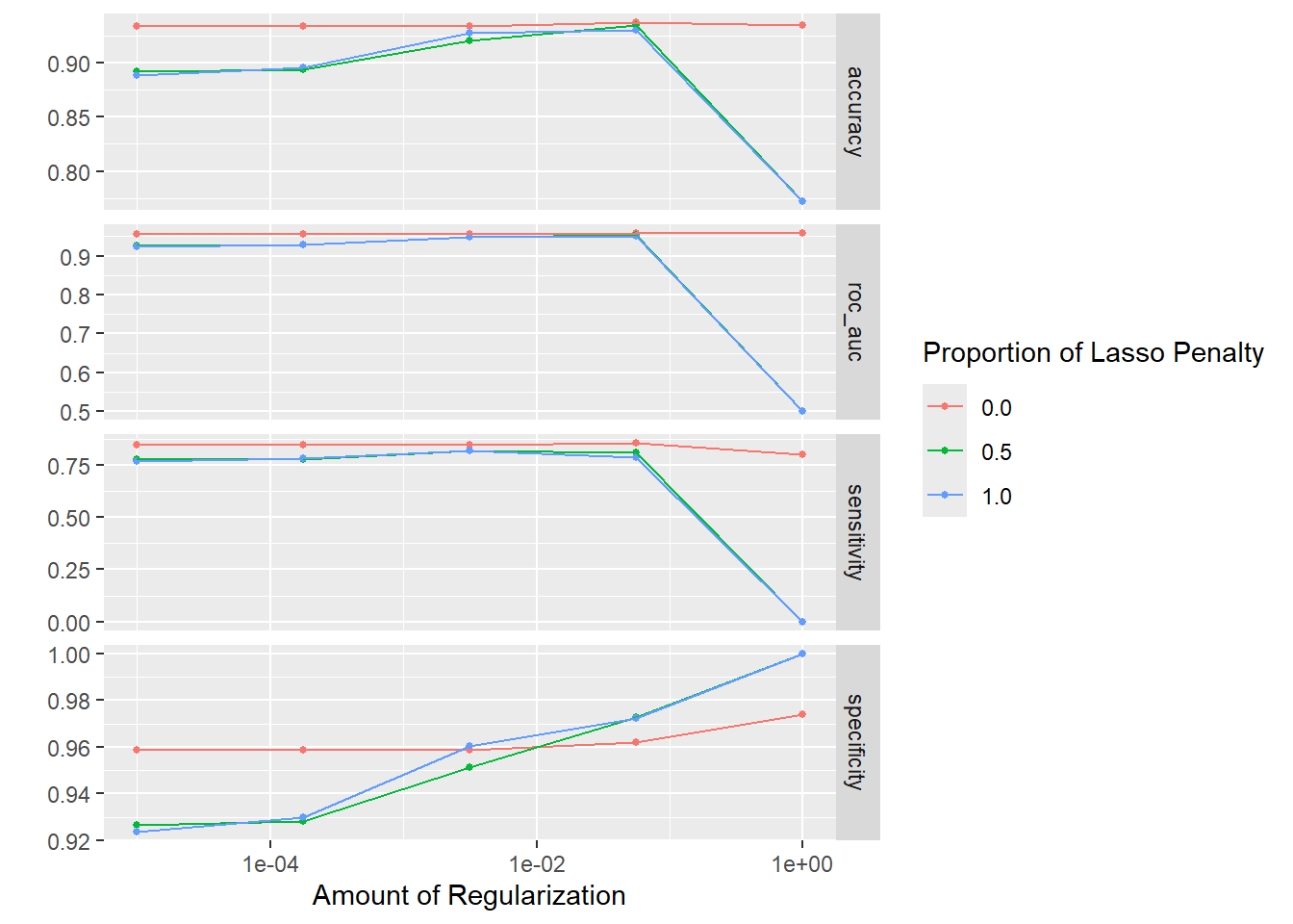 relocate(ID)In Part 3a we introduced some machine learning methods that relied on hyperparameters in order to be run. This included logistic regression using glmnet that can “shrink” the influence of features in our data. The amount of shrinkage is controlled by the arguments penalty (also known as \(\lambda\)) and mixture (aka \(\alpha\)) in the tidymodels specification.