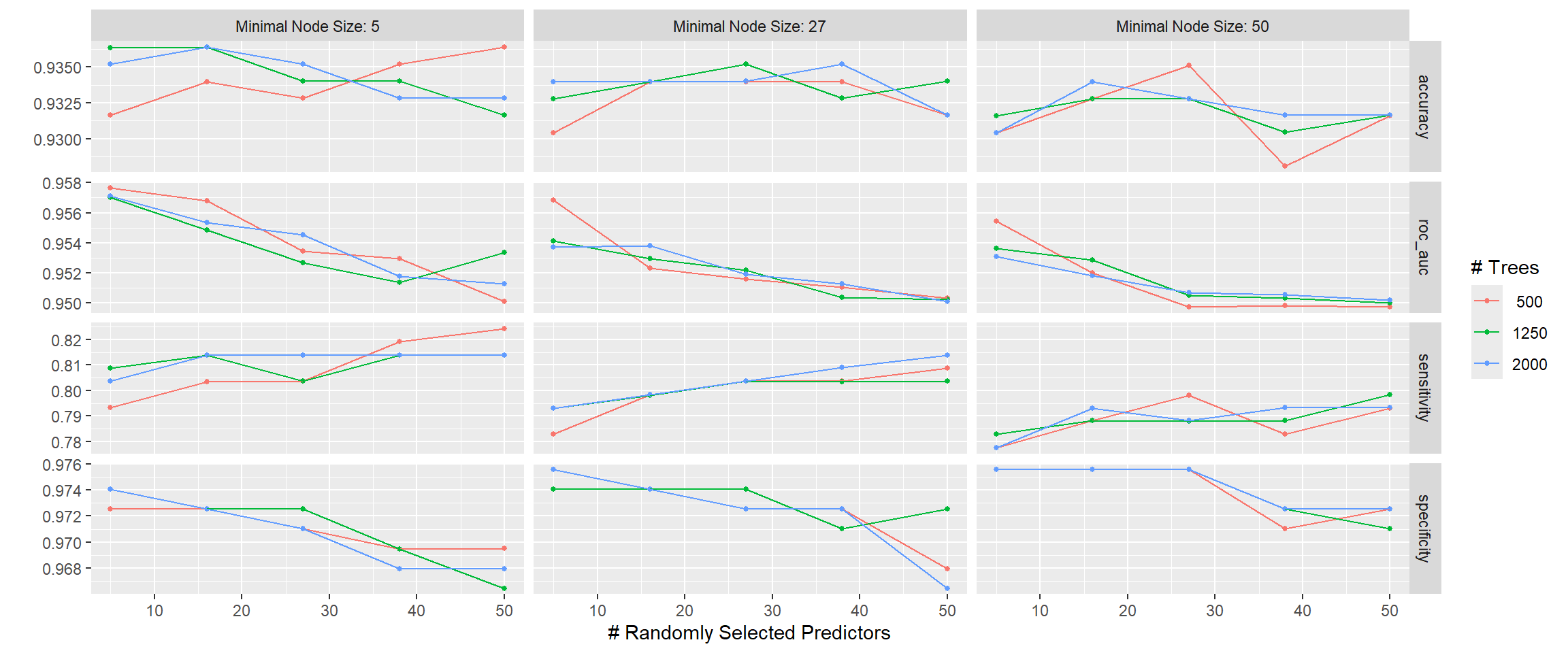 The plot chooses informative labels where “Minimal Node Size” = min_n and “# Randomly Selected Predictors” = mtry. If we wish to focus on Area Under the Curve (roc_auc) the best combination looks to be lower min_n and mtry.