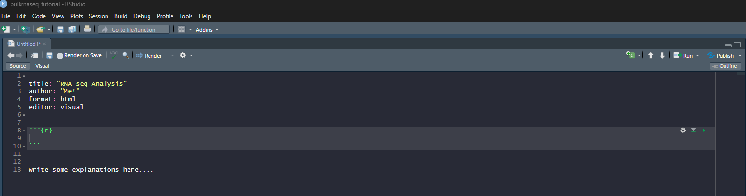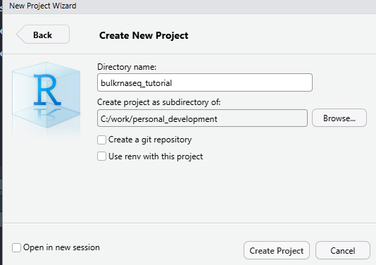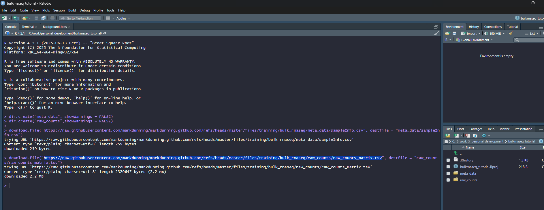 In the screenshot, I am using a directory (which doesn’t exist at this point) called bulkrnaseq_tutorial in c:\work\personal_development. RStudio should now refresh and your working directory will be the location that you specified. Now we will use some code to download the example data. Again, I suggest you copy from below rather than typing manually.