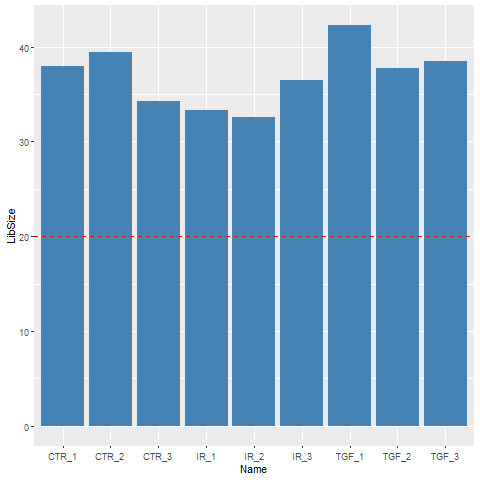 We can tell by the column and row labels that the heatmap shows very good agreement between experiment groups IR, TGF and CTR. To make this clearer a row of coloured blocks can be added under the sample dendrogram. pheatmap will take care of the labeling provided we supply a data frame with one row for each sample we want to label, and a column for each experimental or biological condition of interest. Lets use the condition and Treated columns.
