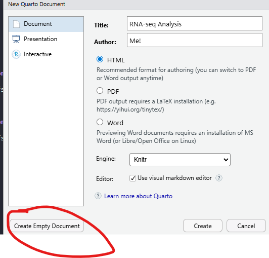 Clicking the “Create Empty Document” button on the pop-up that appears will create a blank quarto document that you can use to type the code from this tutorial, and any comments you may wish to make along the way. The Title and Author boxes can be filled with anything you like. They are used when you want to create a report document from your code. A new panel should appear in RStudio which is your bare bones analysis. The title and author lines should correspond to the text you entered (if any) when creating the document