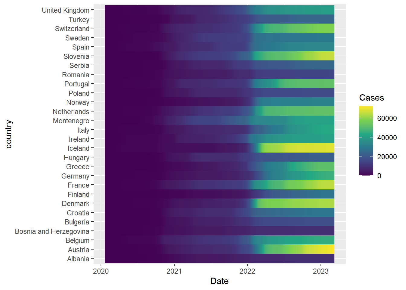 ggplot(aes(x = Date, y = country,fill=Cases)) + geom_tile() + scale_fill_viridis_c()Joining with `by = join_by(country)`